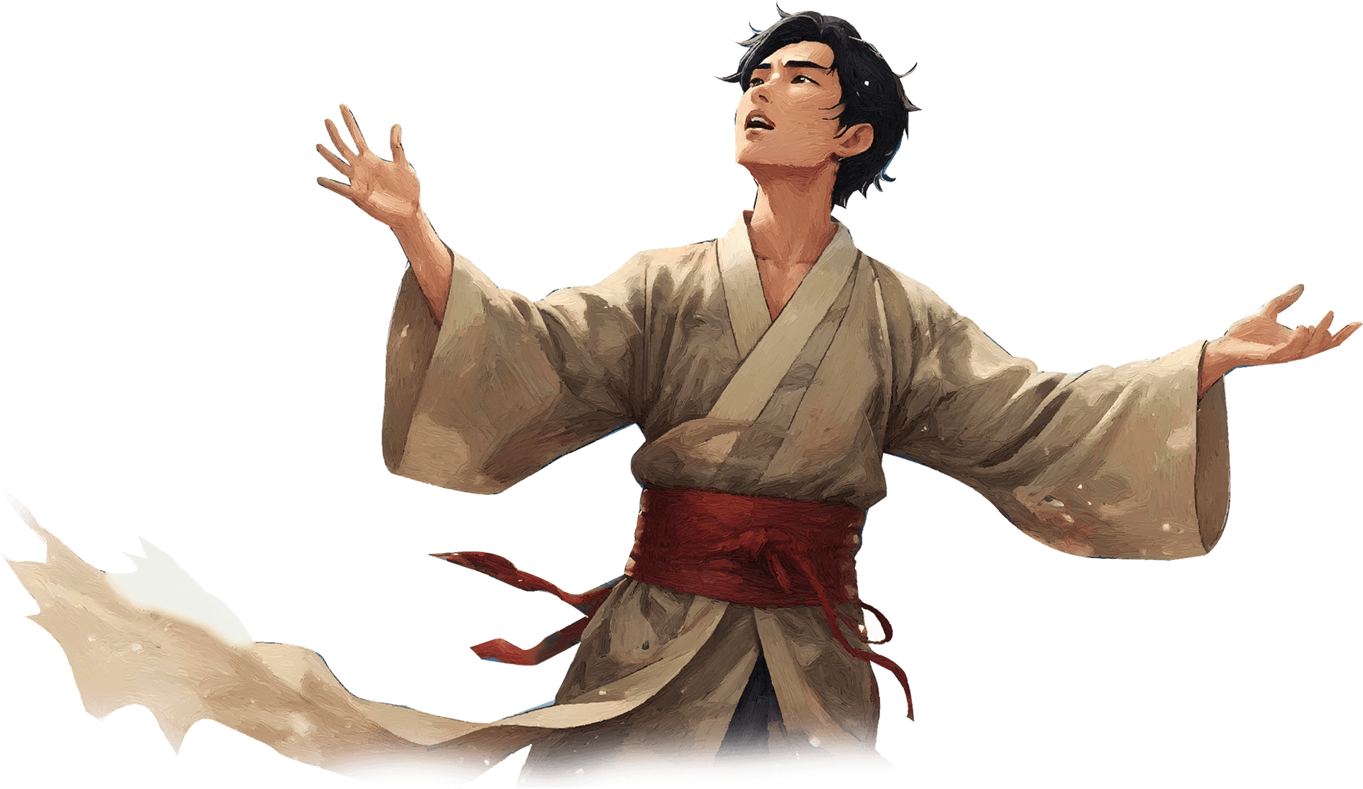 Le souhait de Kenji se réalisa et la nature se déchaîna soudainement : une légère brise se transforma en vents violents, la foudre des dieux tomba du ciel, les dragons rugirent et l’orage gronda, tandis que des éclairs serpentèrent dans le ciel. Tout autour de Kenji, des centaines de feuilles tournoyaient dans les airs avant de disparaître, emportées par les bourrasques qui agitaient le bonsaï.