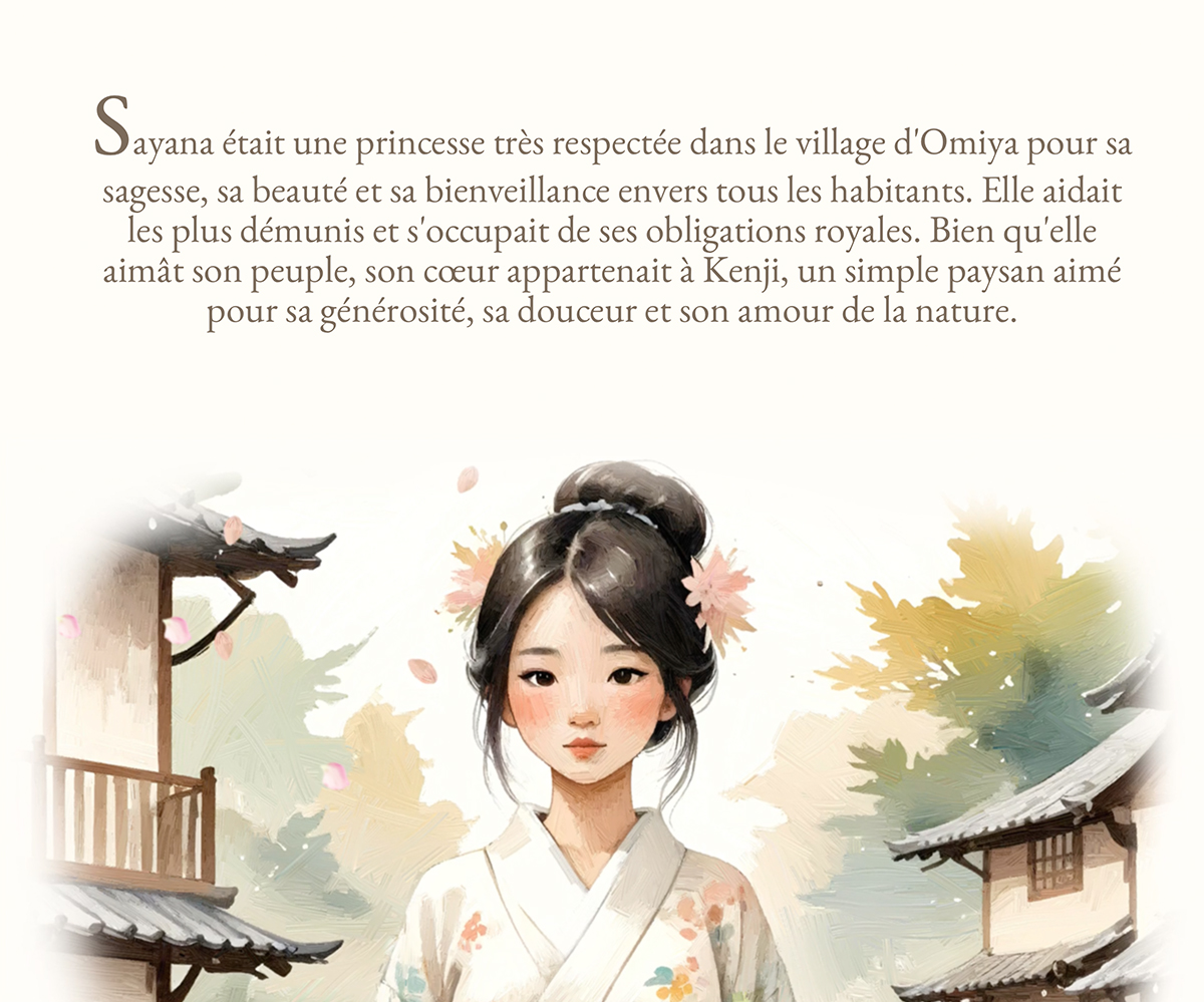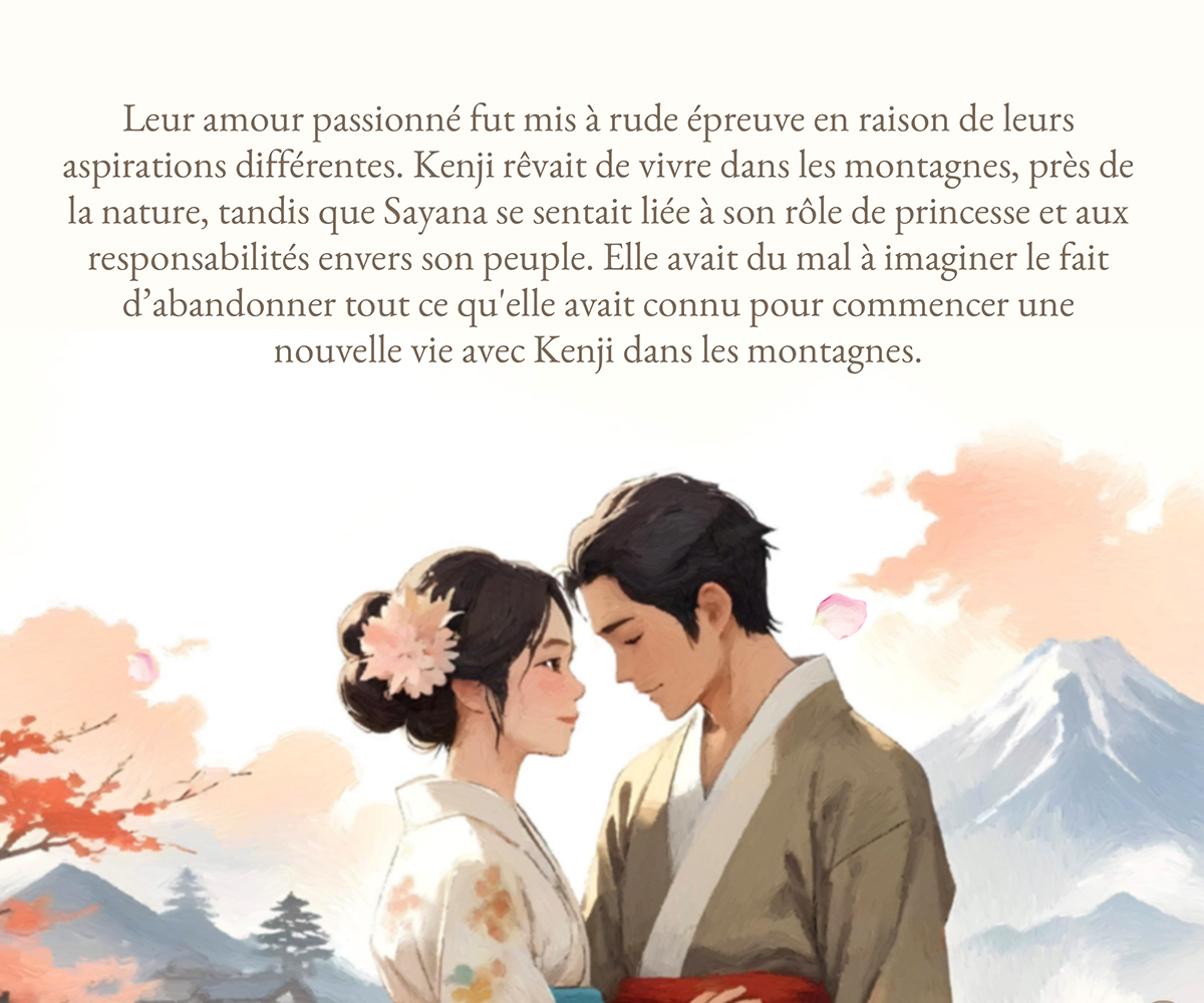 Sayana, une princesse admirée pour sa sagesse et sa beauté, et Kenji, un paysan au grand cœur, forment un couple improbable mais passionné. Leur amour est mis à l'épreuve par leurs aspirations divergentes et les défis de la vie. Un précieux bonsaï, symbole de leur union, joue un rôle central dans leur relation. Entre montagnes majestueuses et château imposant, découvrez une légende empreinte de courage, de persévérance et d'un amour qui triomphe de tous les obstacles.